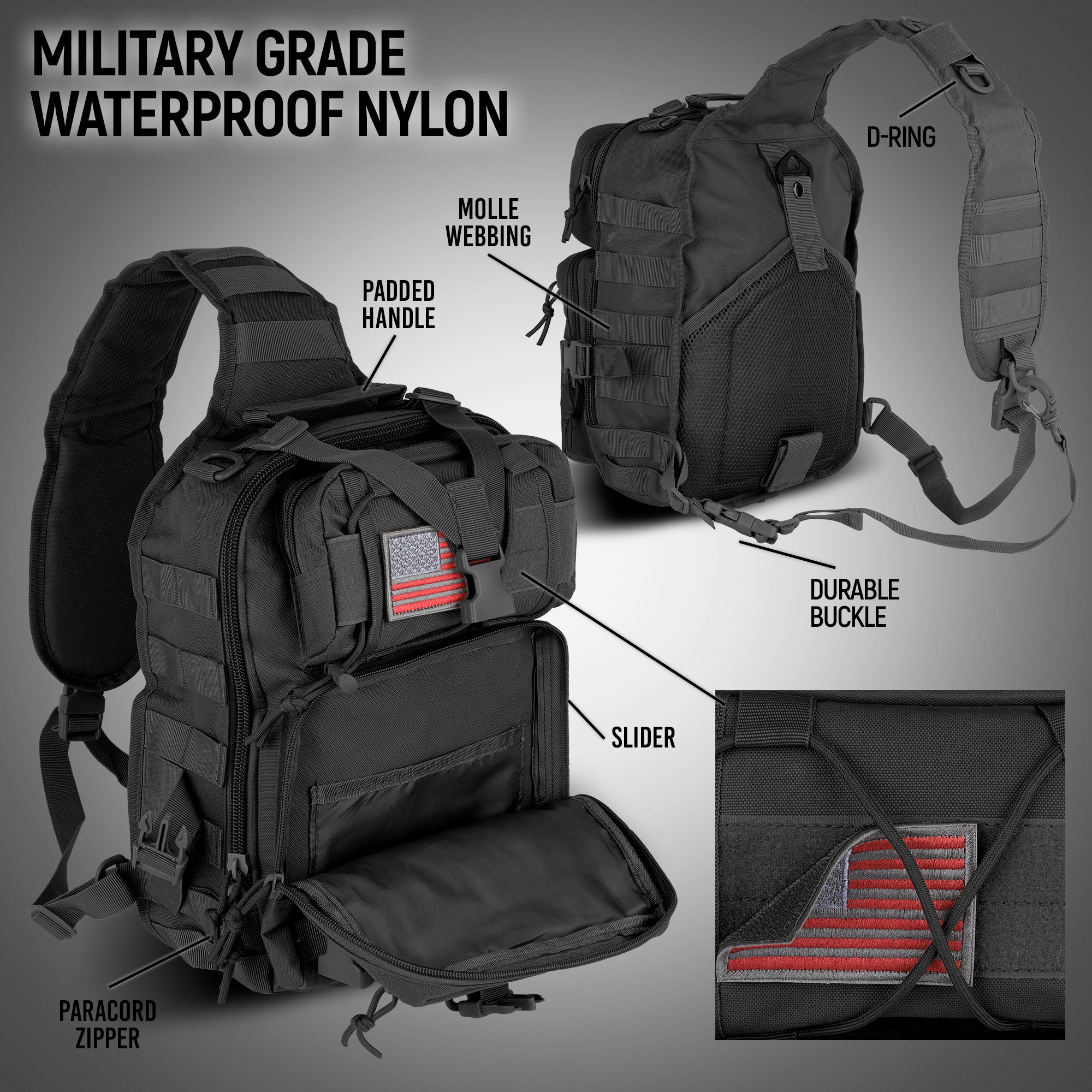 • SMALL & LIGHTWEIGHT: This tactical sling bag measures at 13.75 x 9 x 5 inches and has a volume of about 14 liters. This is the perfect small tactical backpack for men.